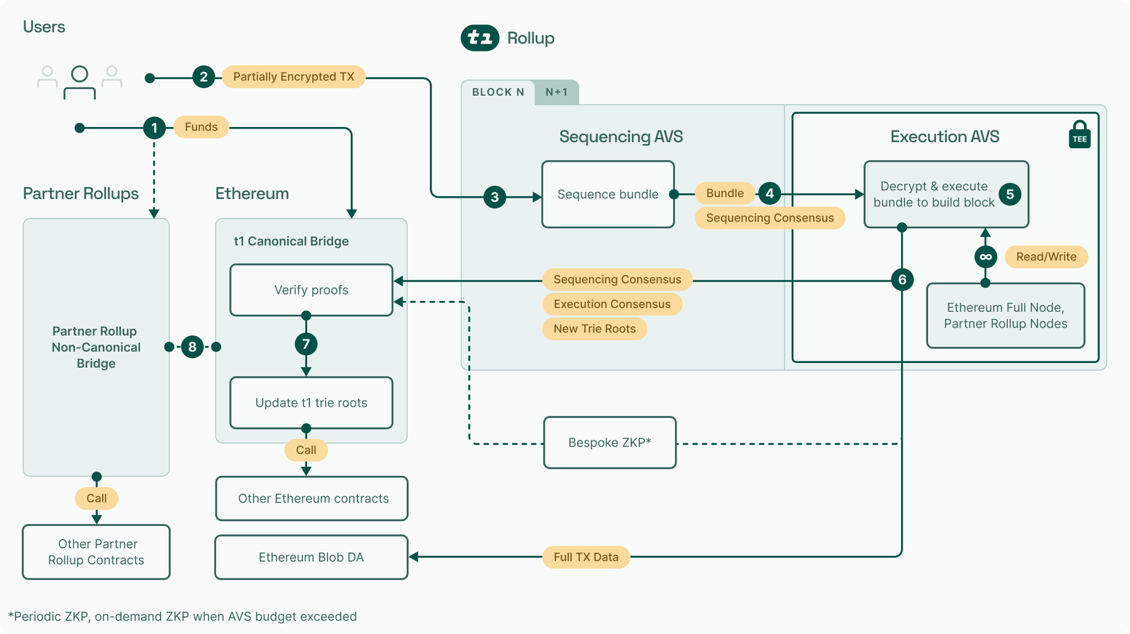Alice changes her wallet’s network to t1, creates a t1-native transaction (with some fields encrypted) to the shared rotating TEE pubkey), uses her wallet to sign it, and submits it to the network (i.e. the t1 mempool); this may or may not be a specially-treated withdrawal transaction (to Ethereum or a Partner Rollup).